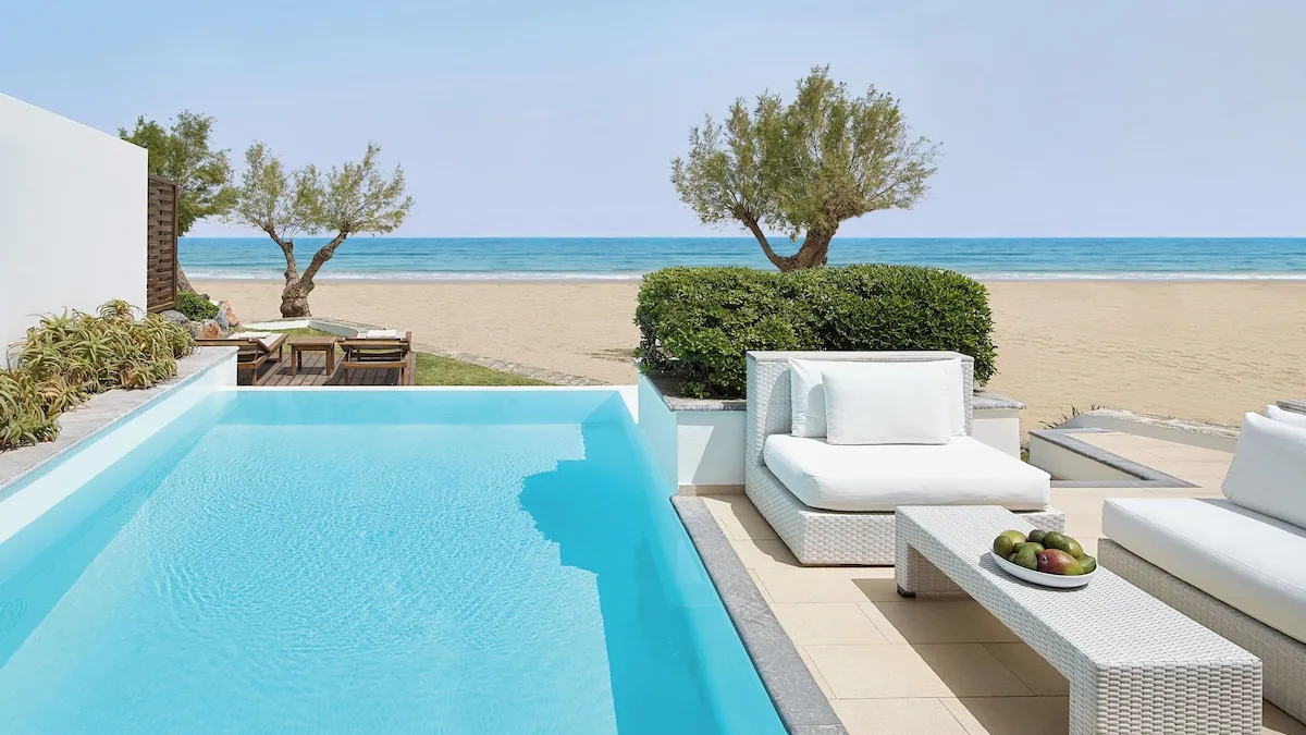 The Amirandes Grecotel Boutique Resort in Agia Pelagia, Greece offers luxurious and comfortable room types, including Deluxe Sea View Rooms, Junior Suites, and Villas with private pools. All rooms feature modern amenities, such as flat-screen TVs, air conditioning, and Wi-Fi, as well as breathtaking views of the Aegean Sea. Guests can also enjoy the resort's on-site restaurants, spa, and outdoor pool.