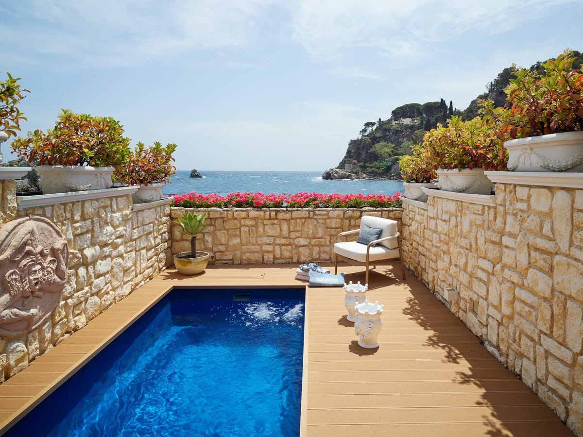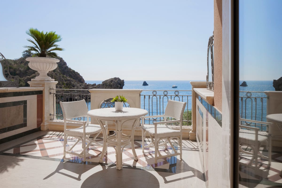 The Mazzaro Sea Palace - VRetreats offers a variety of luxurious room types, ranging from Deluxe Suites to Grand Suites with private terraces and breathtaking views of the Mediterranean Sea. Each room is exquisitely designed with modern amenities and provides guests with a truly unique and luxurious experience.