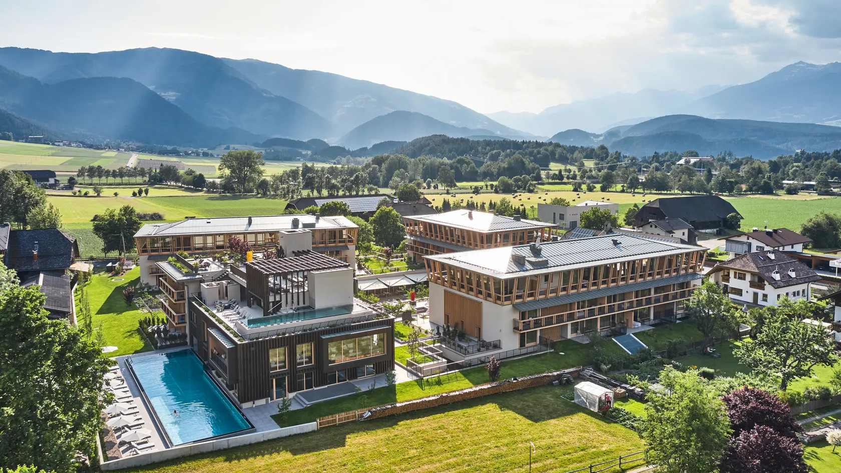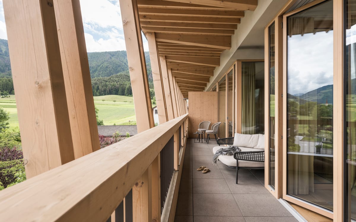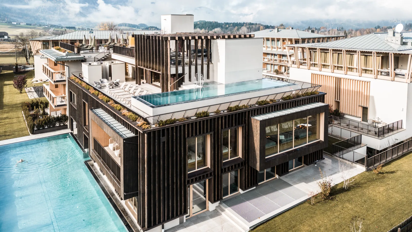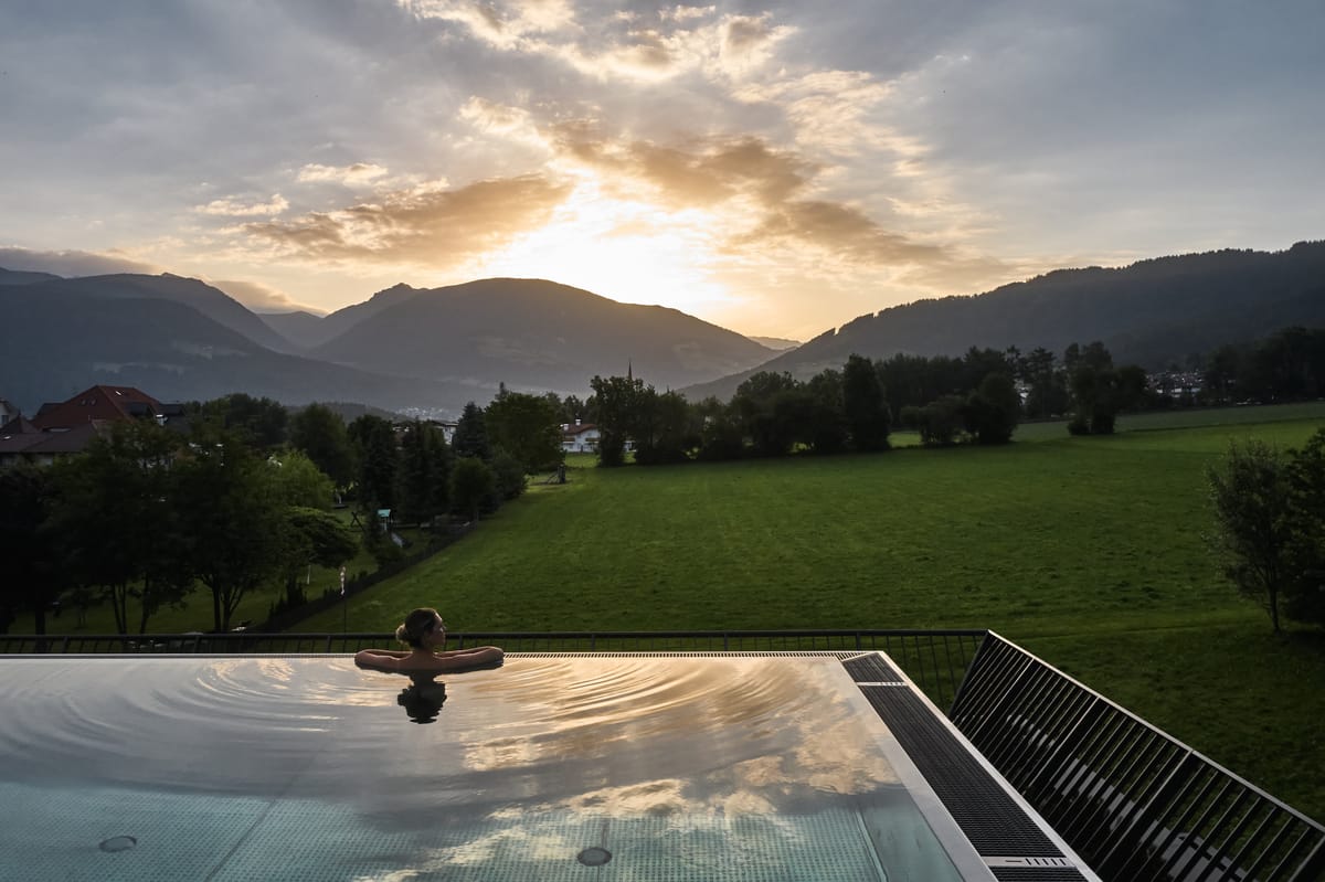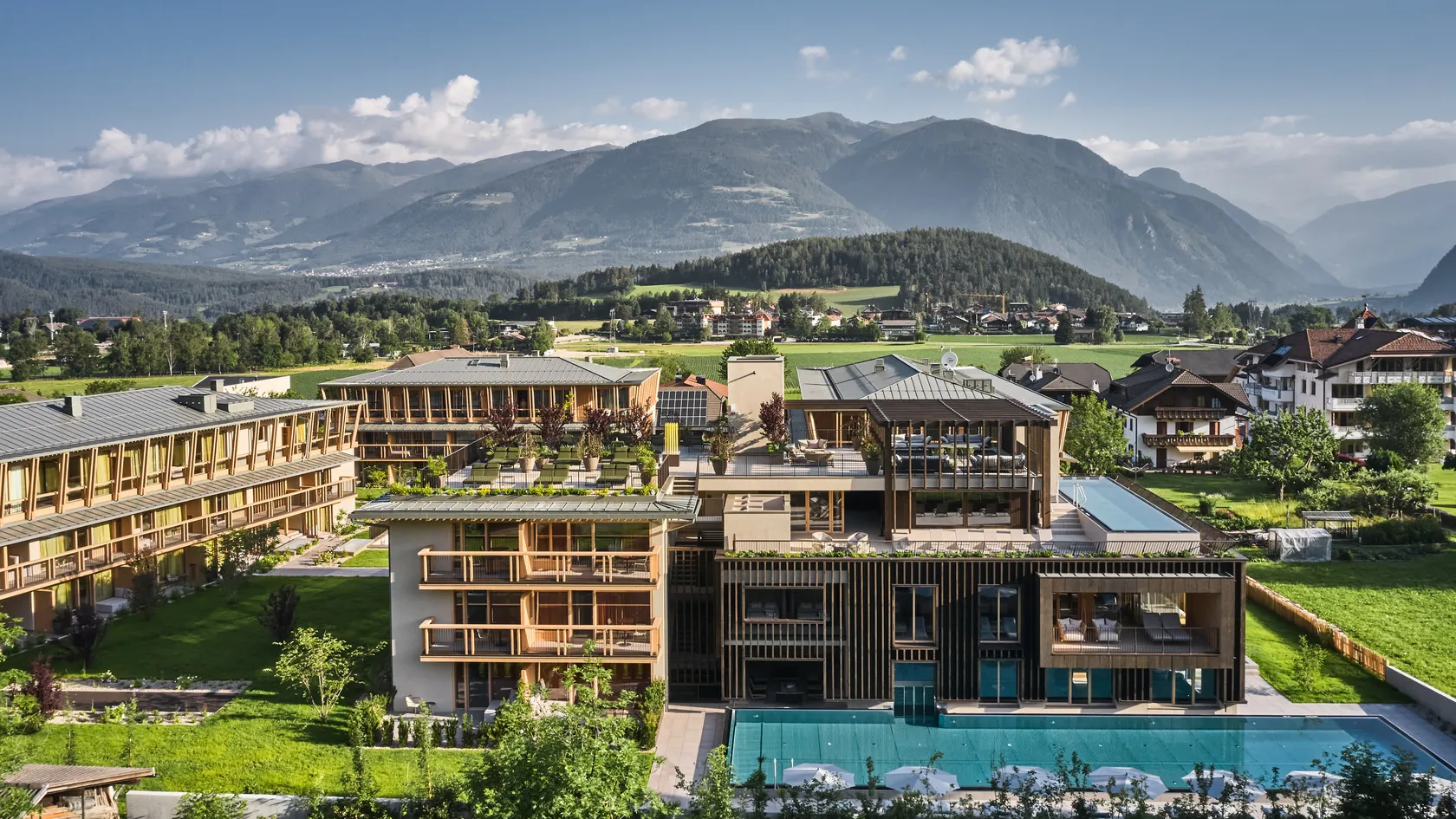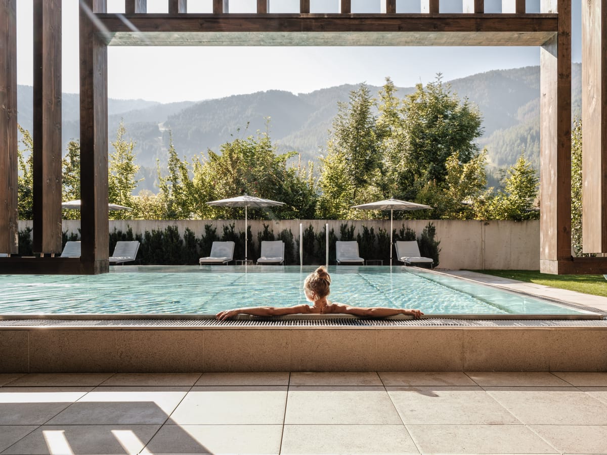 - Rooftop pool and panoramic reclining area with a view of Kronplatz
