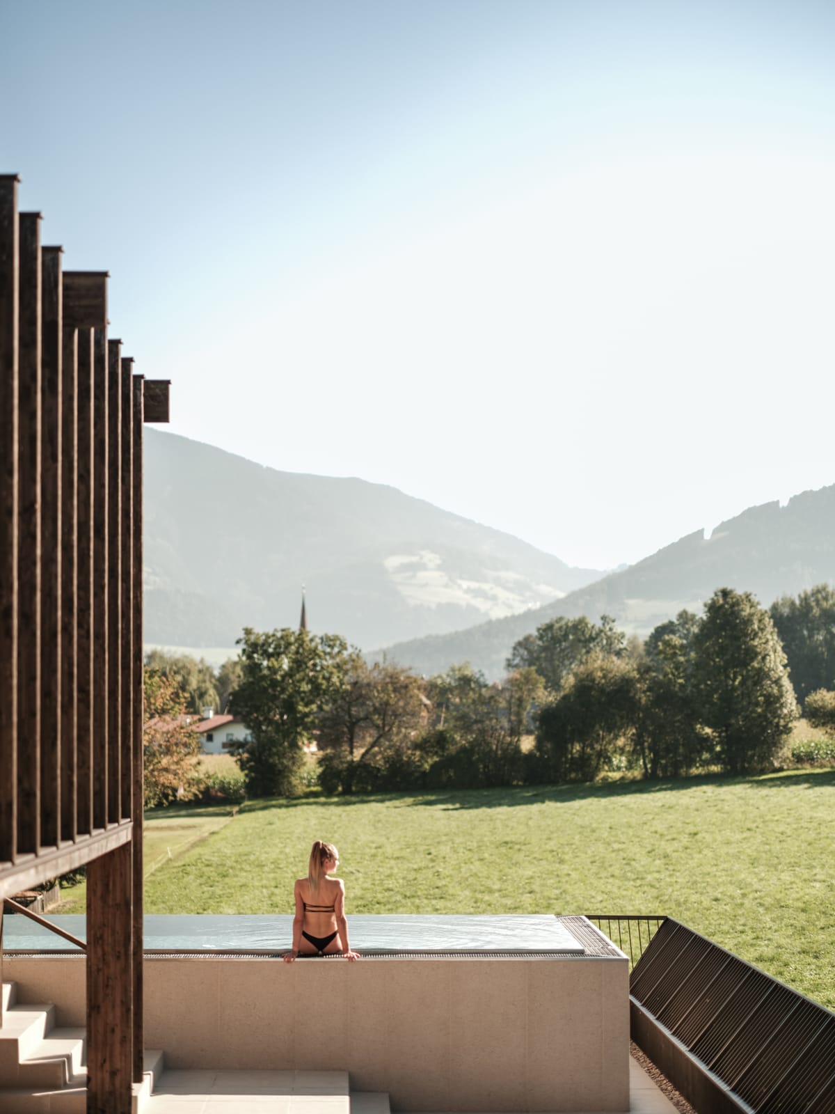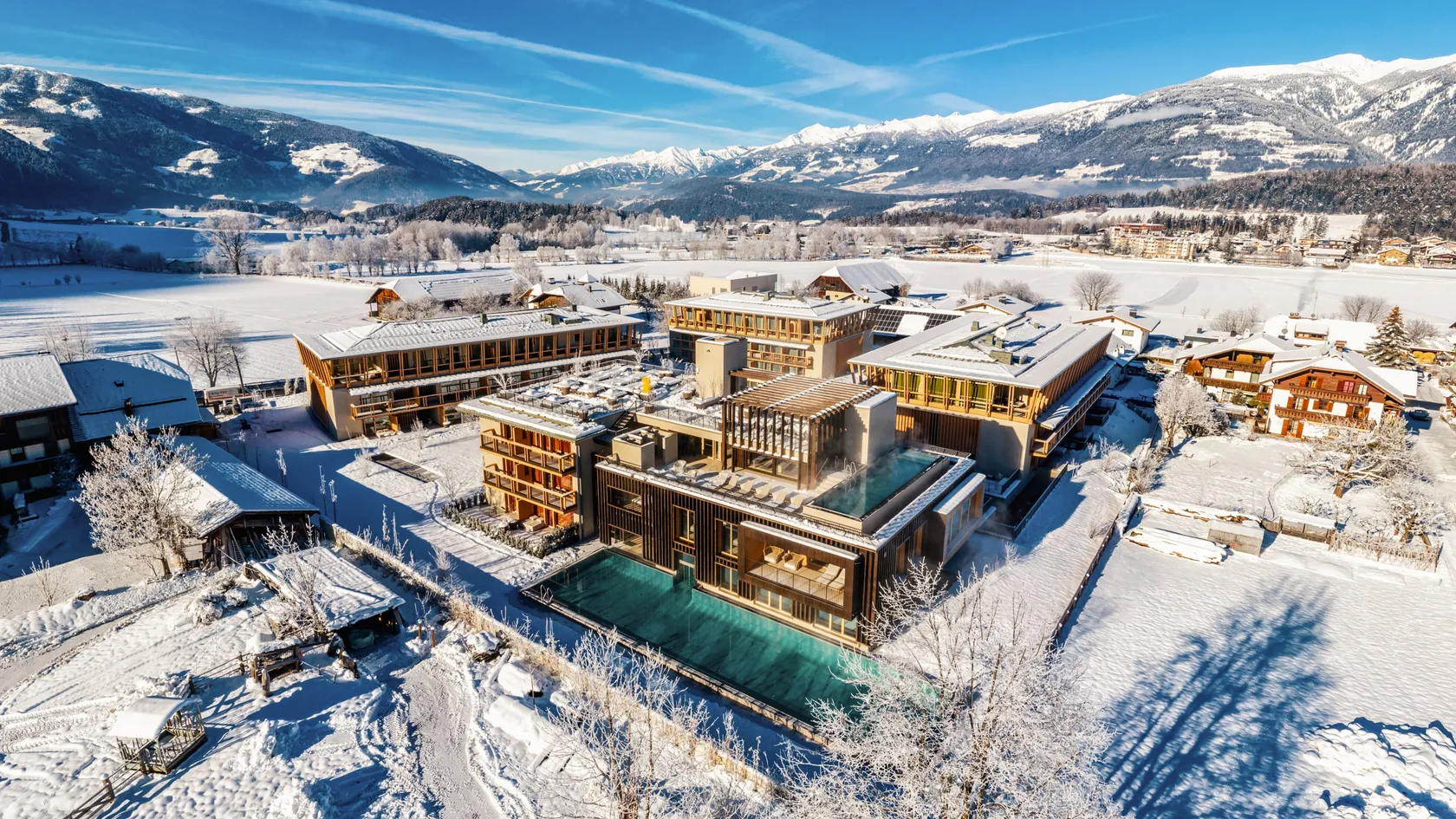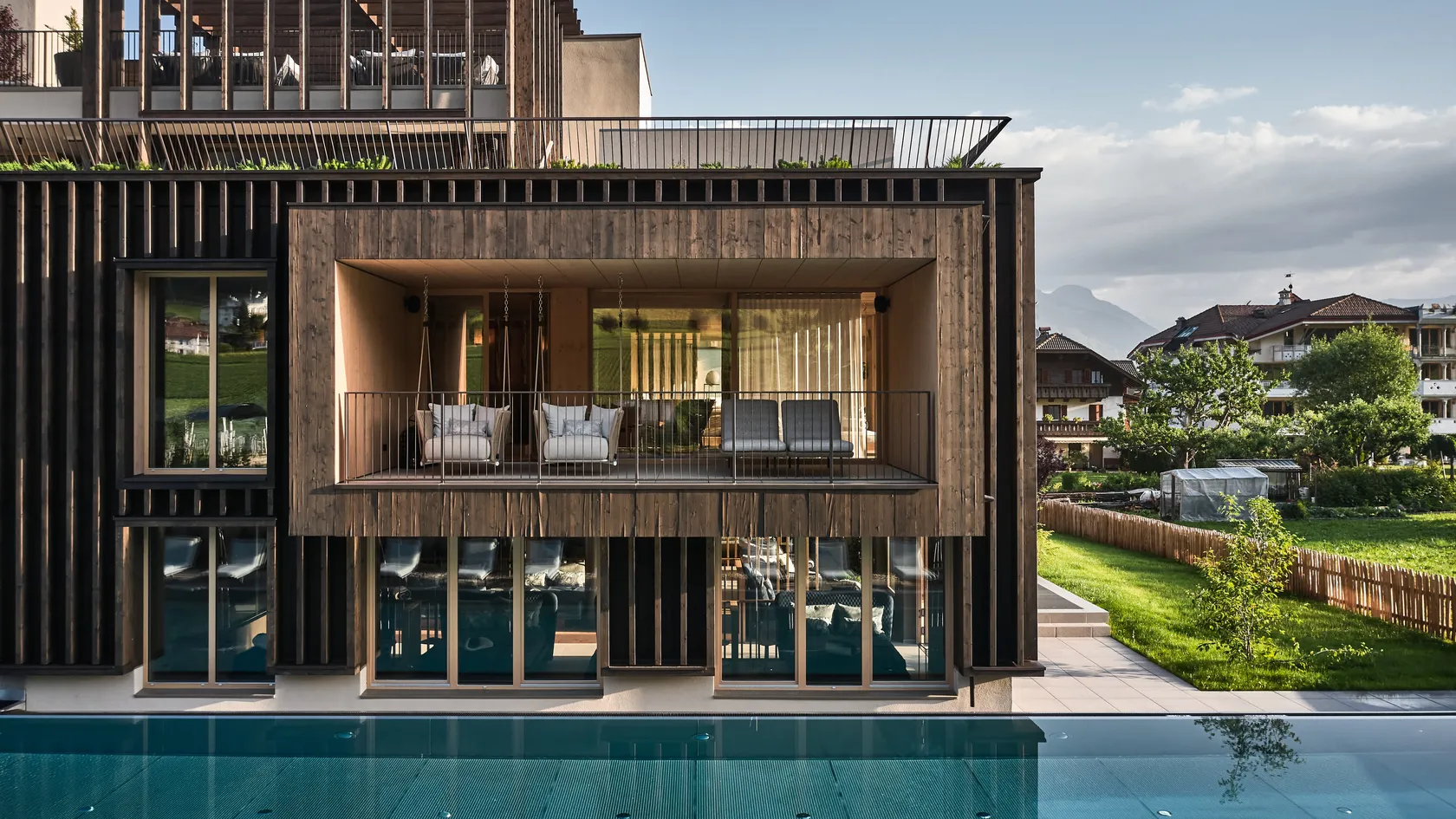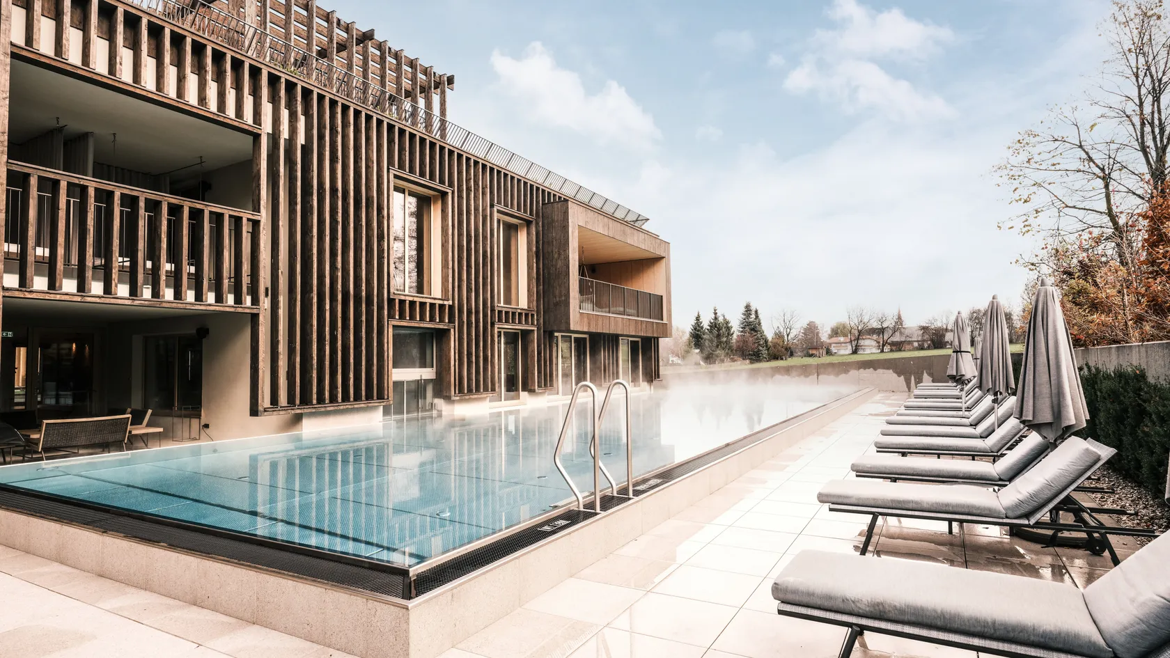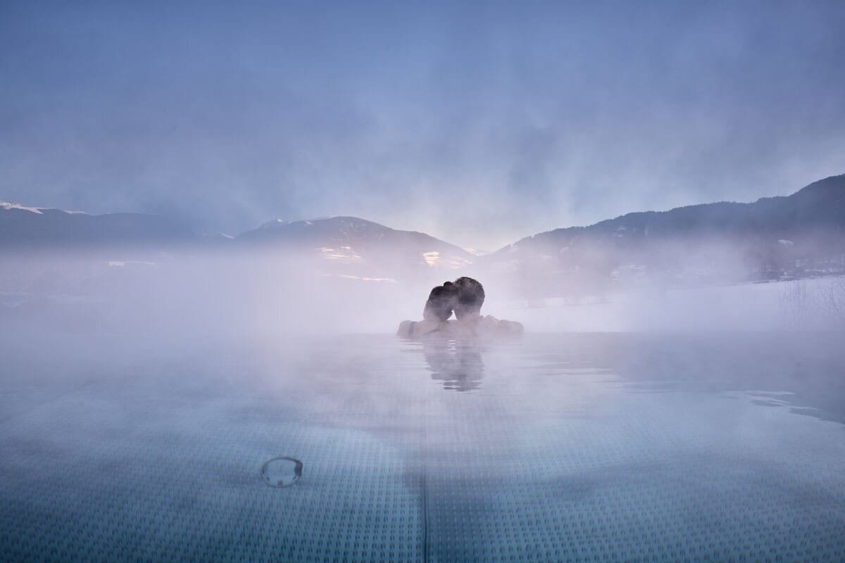 - Rooftop pool and panoramic reclining area with a view of Kronplatz