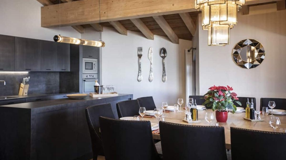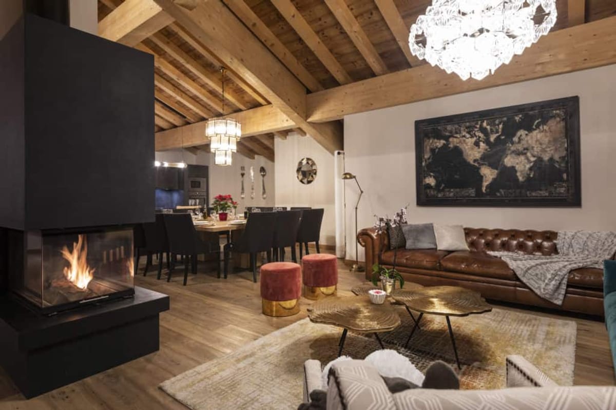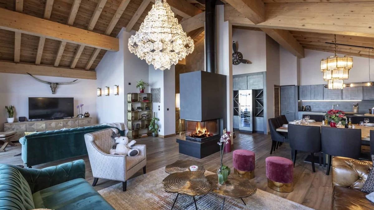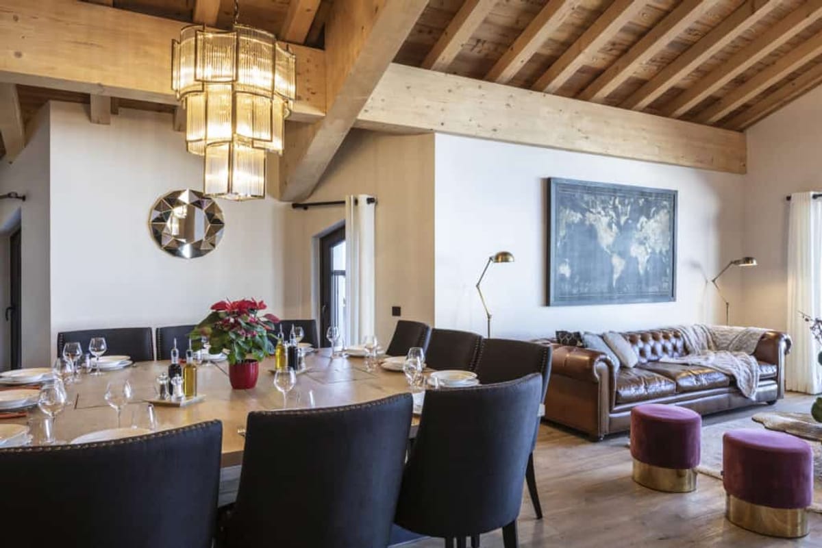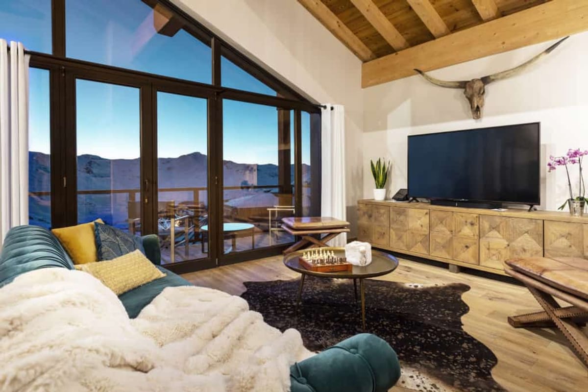 The chalet also promises wonderful moments of conviviality in its fully-equipped open-plan kitchen, arranged around the impressive solid wood dining table. The large light-filled living room, with its large bay windows, is the perfect spot to gather around the fireplace or catch a holiday movie on the big-screen TV.