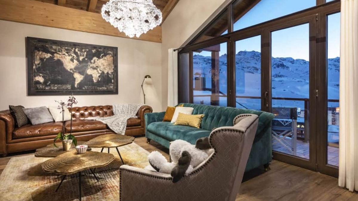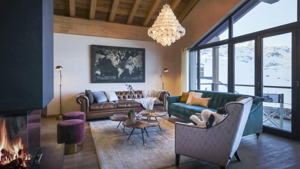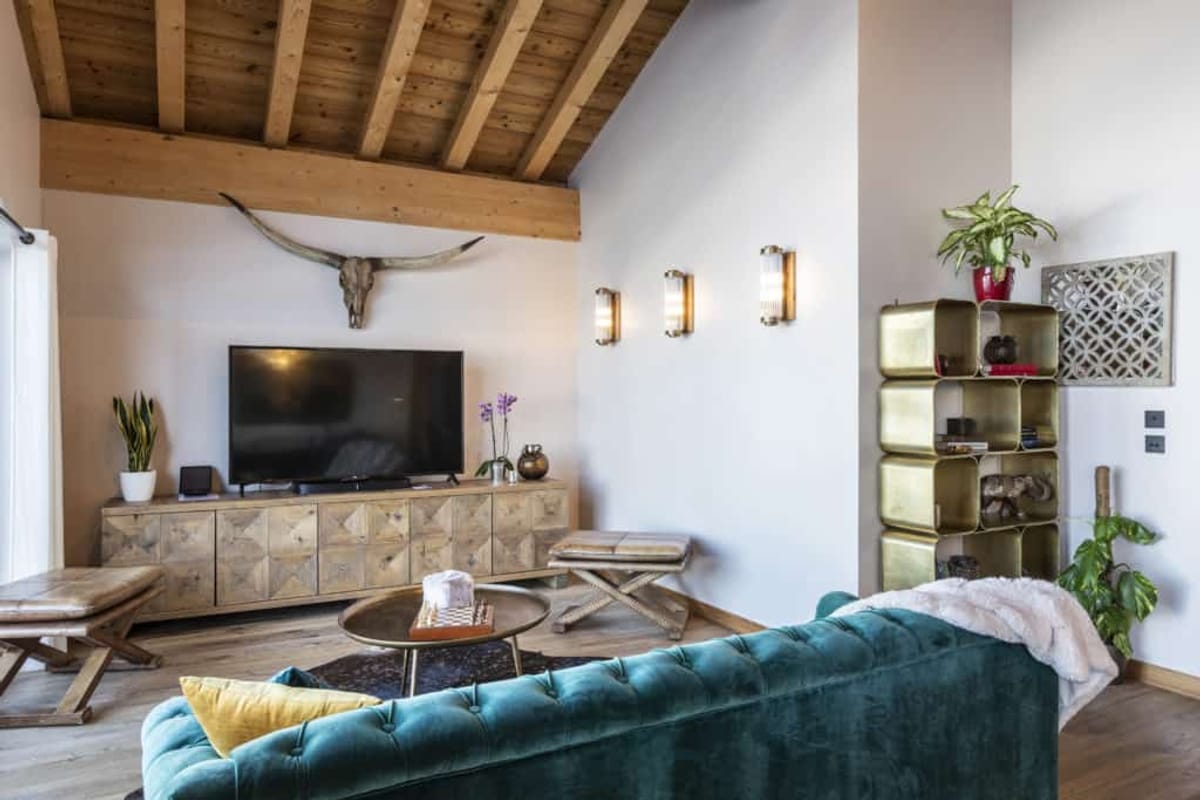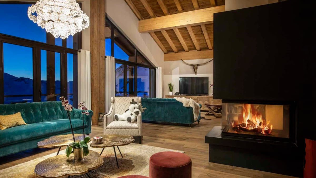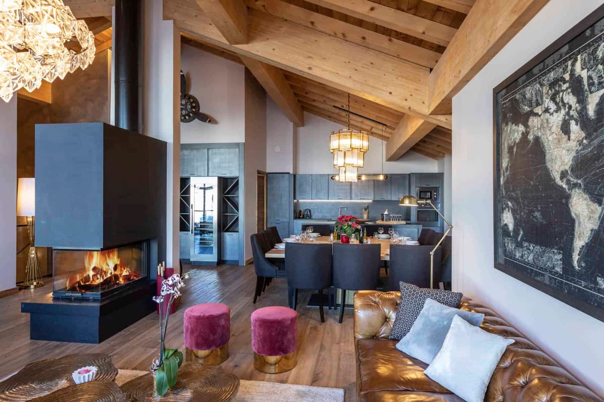 The chalet also promises wonderful moments of conviviality in its fully-equipped open-plan kitchen, arranged around the impressive solid wood dining table. The large light-filled living room, with its large bay windows, is the perfect spot to gather around the fireplace or catch a holiday movie on the big-screen TV.