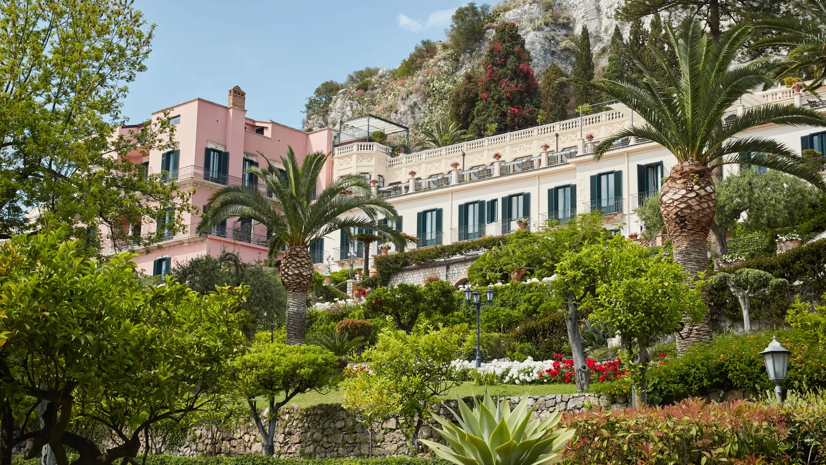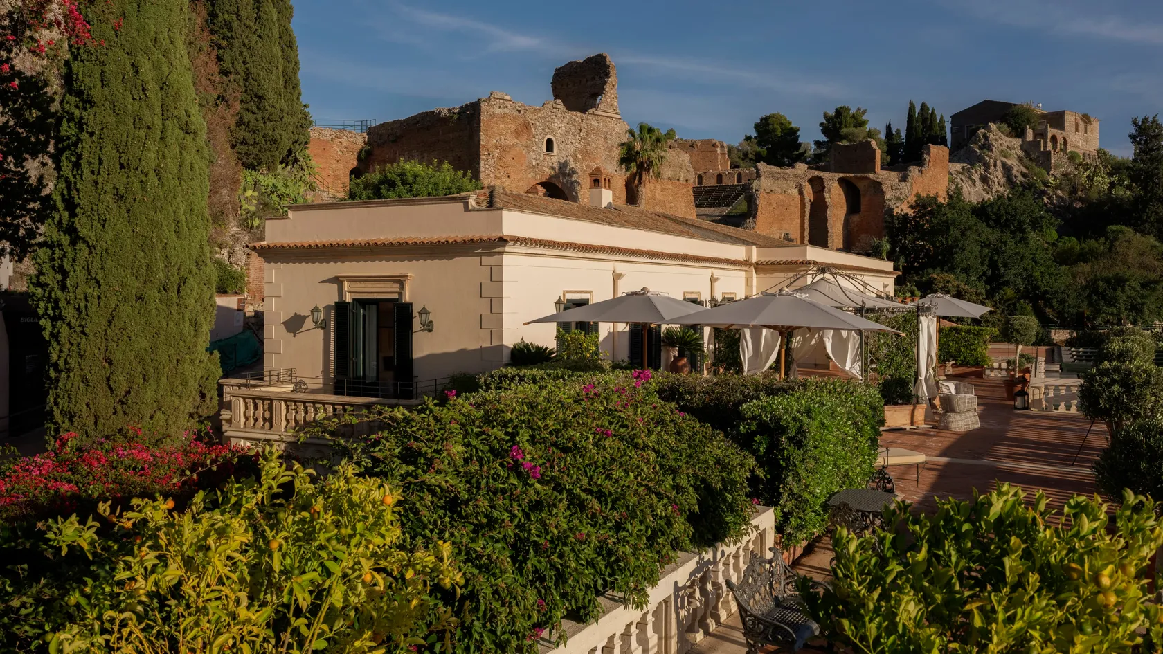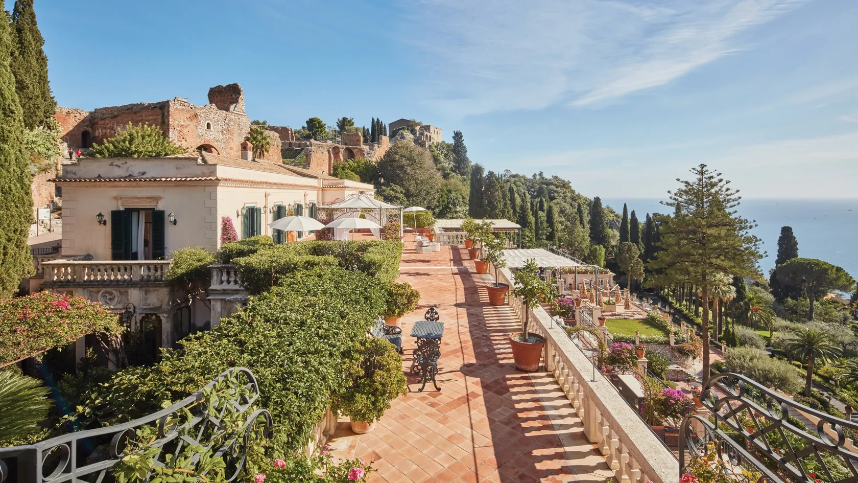47 rooms and 24 suites, most with terraces or balconies affording spellbinding views over the coastline. The décor evokes traditional Sicilian style with a charming blend of elegance and comfort. As well as the Timeo Building, guests can stay in Villa Flora, a country house just 50 metres (164 feet) away.