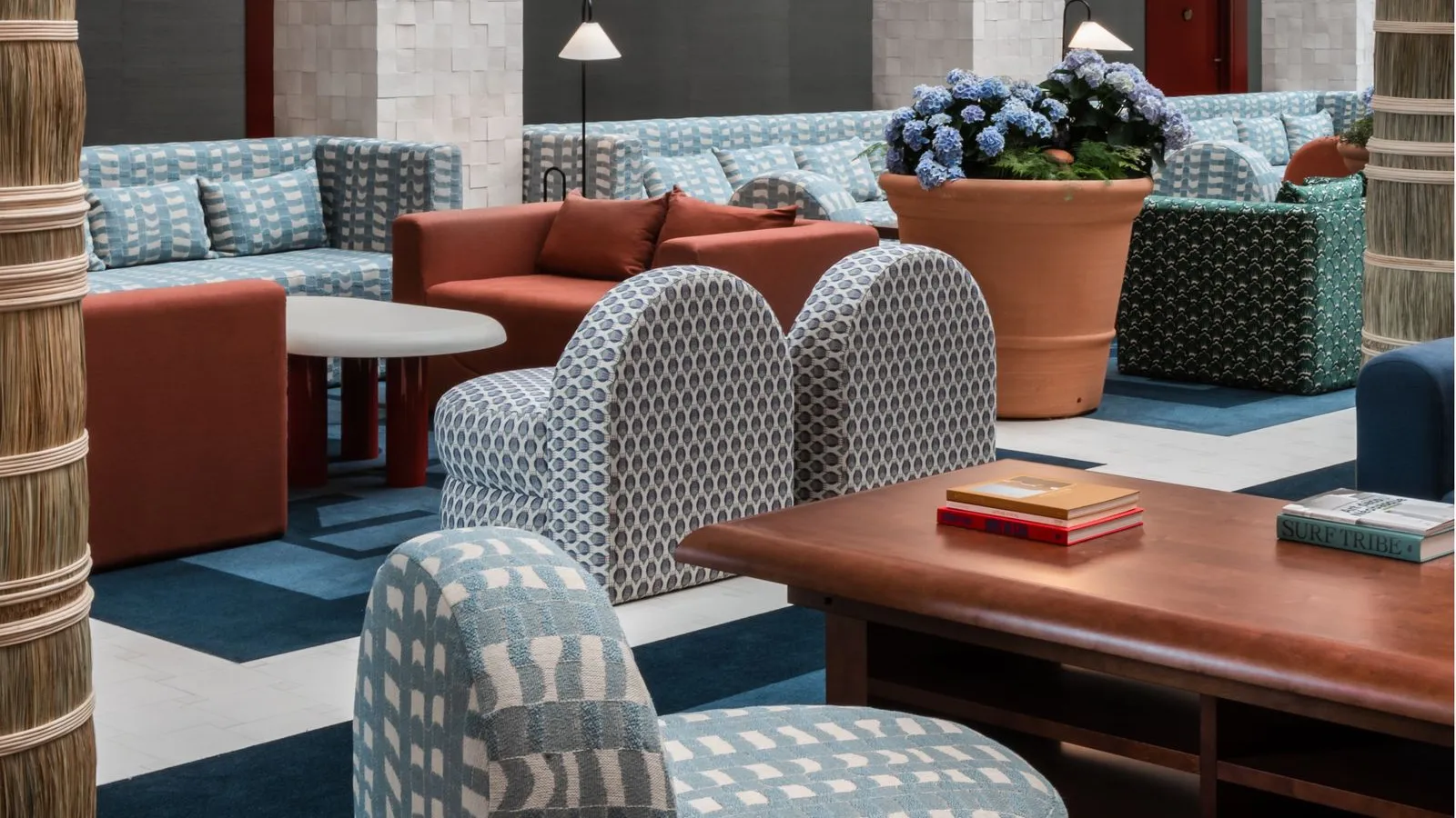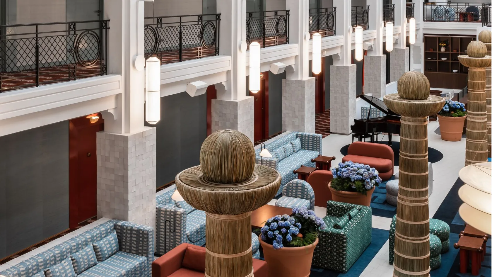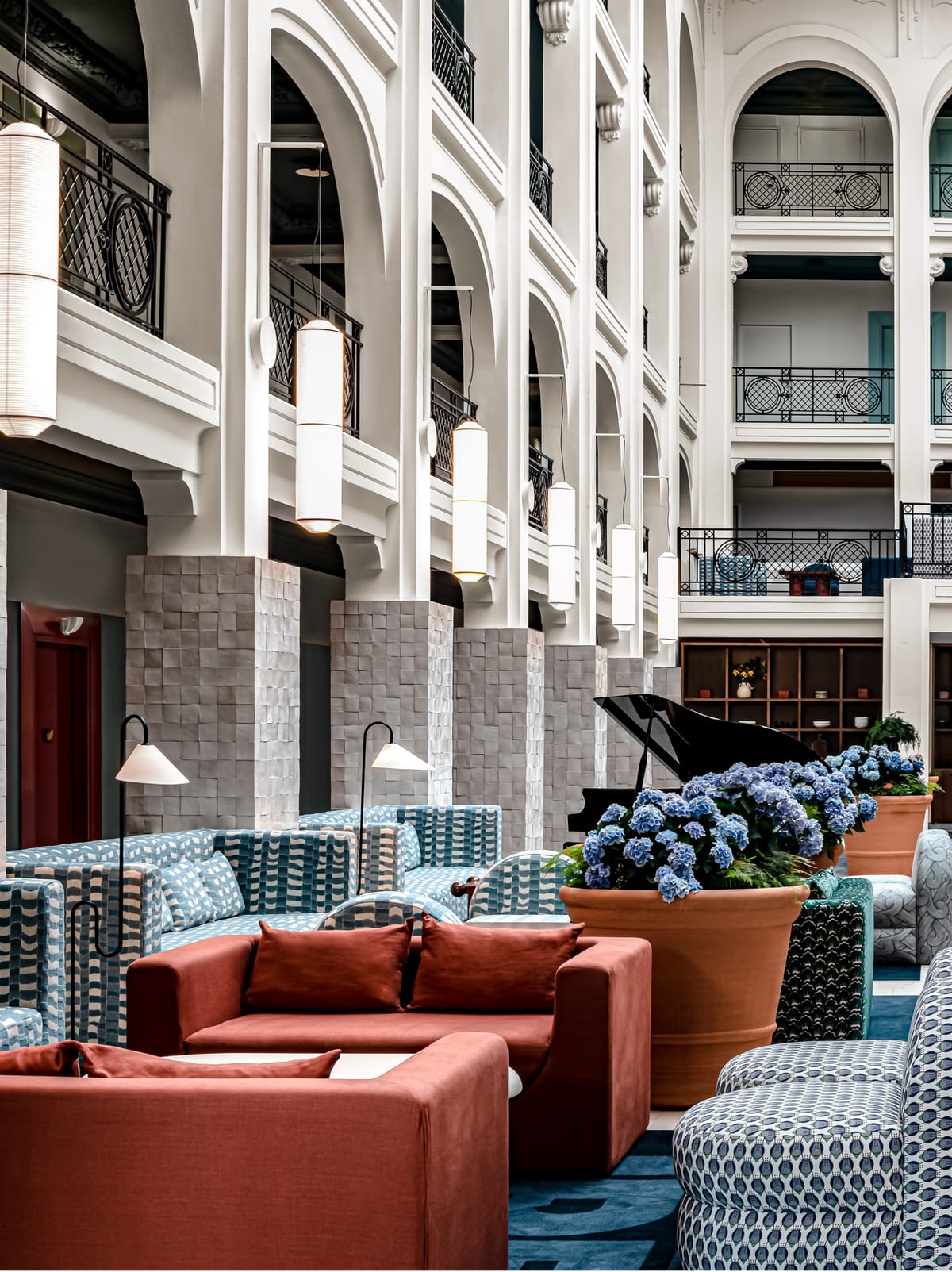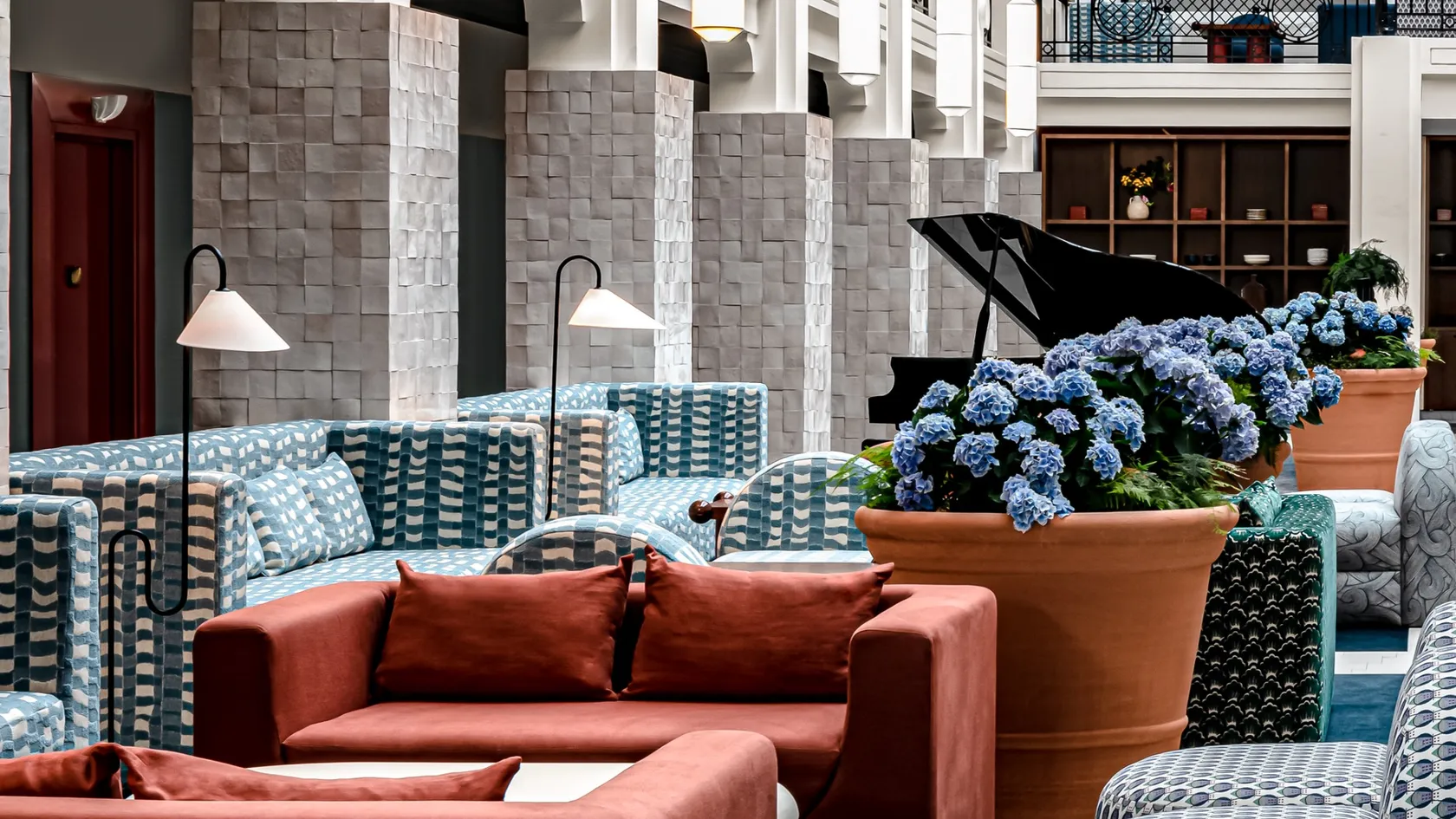 Accessible from corridors opening onto the atrium, the hotel's seventy-two white, blue and mint-green rooms face the ocean or the Golf de Biarritz. Raw materials such as straw and Japanese rope are combined with marine stripes, seashells and ocean liner style: curved and curving forms, long horizontal lines, carpets with aquatic motifs... for spacious, comfortable rooms and suites. Some have breathtaking views of the Atlantic coast.