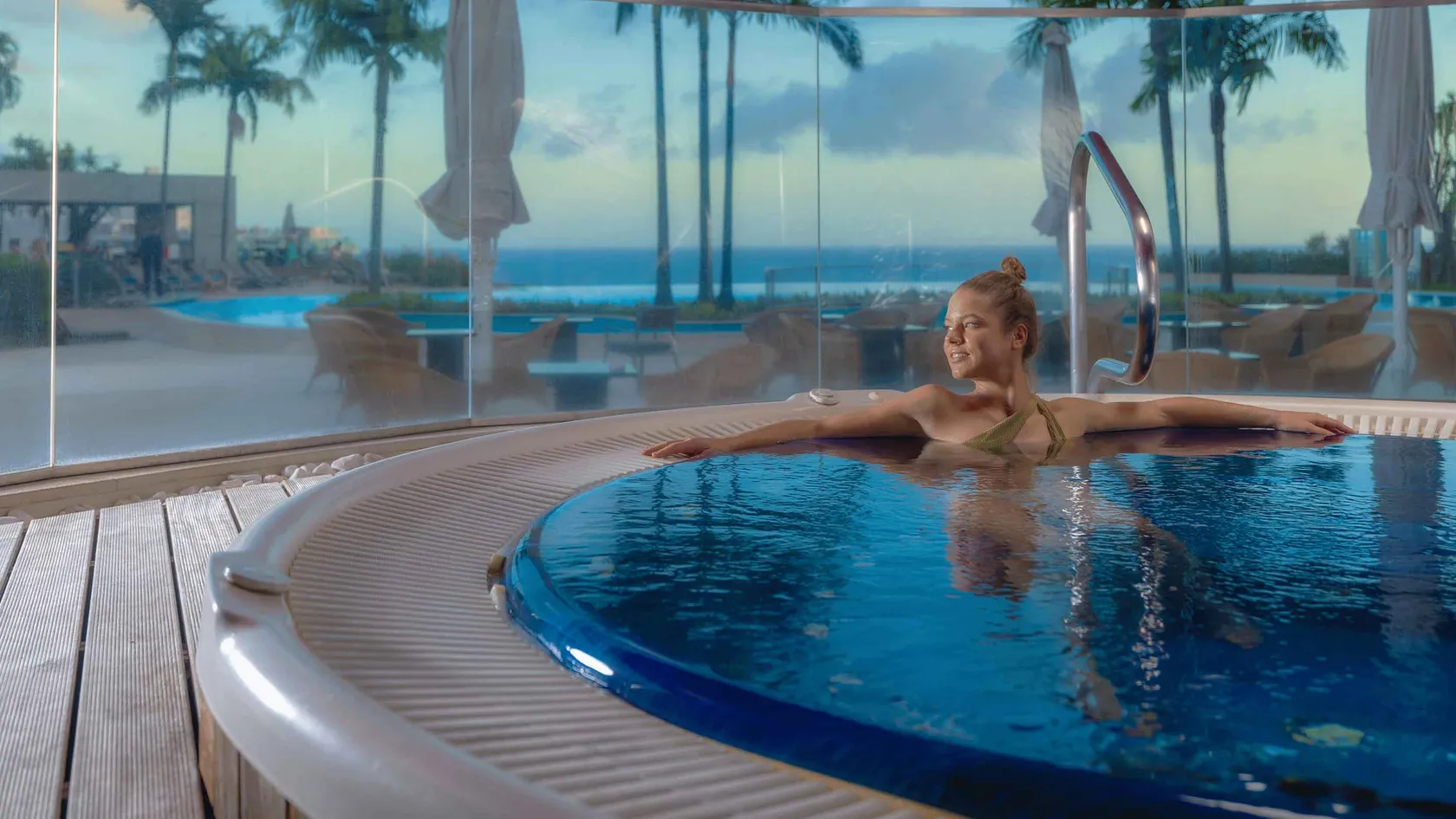 The rooms are spacious but practical, elegant but subdued, and are decorated in black and beige tones. Each has a private balcony, many with panoramic ocean views. They are complete with Wi-Fi, LCD TVs and air conditioning.