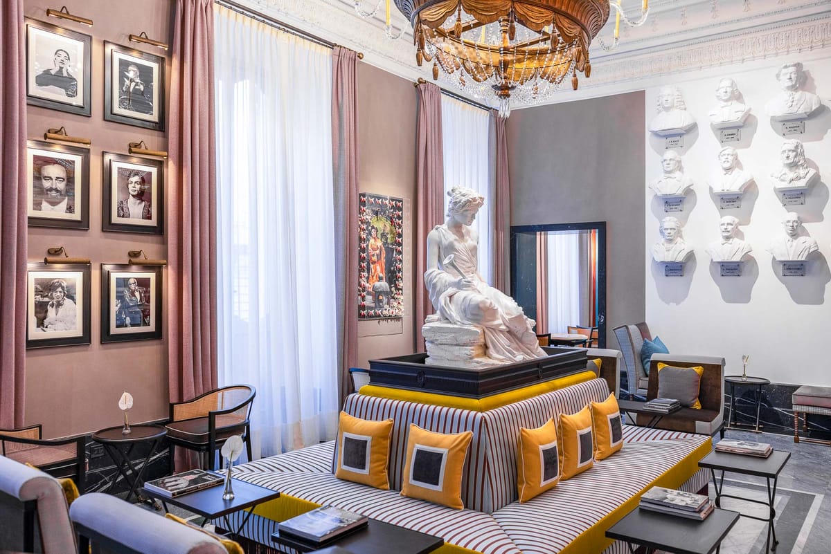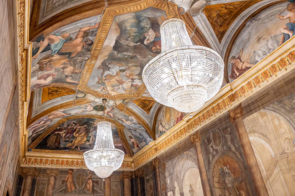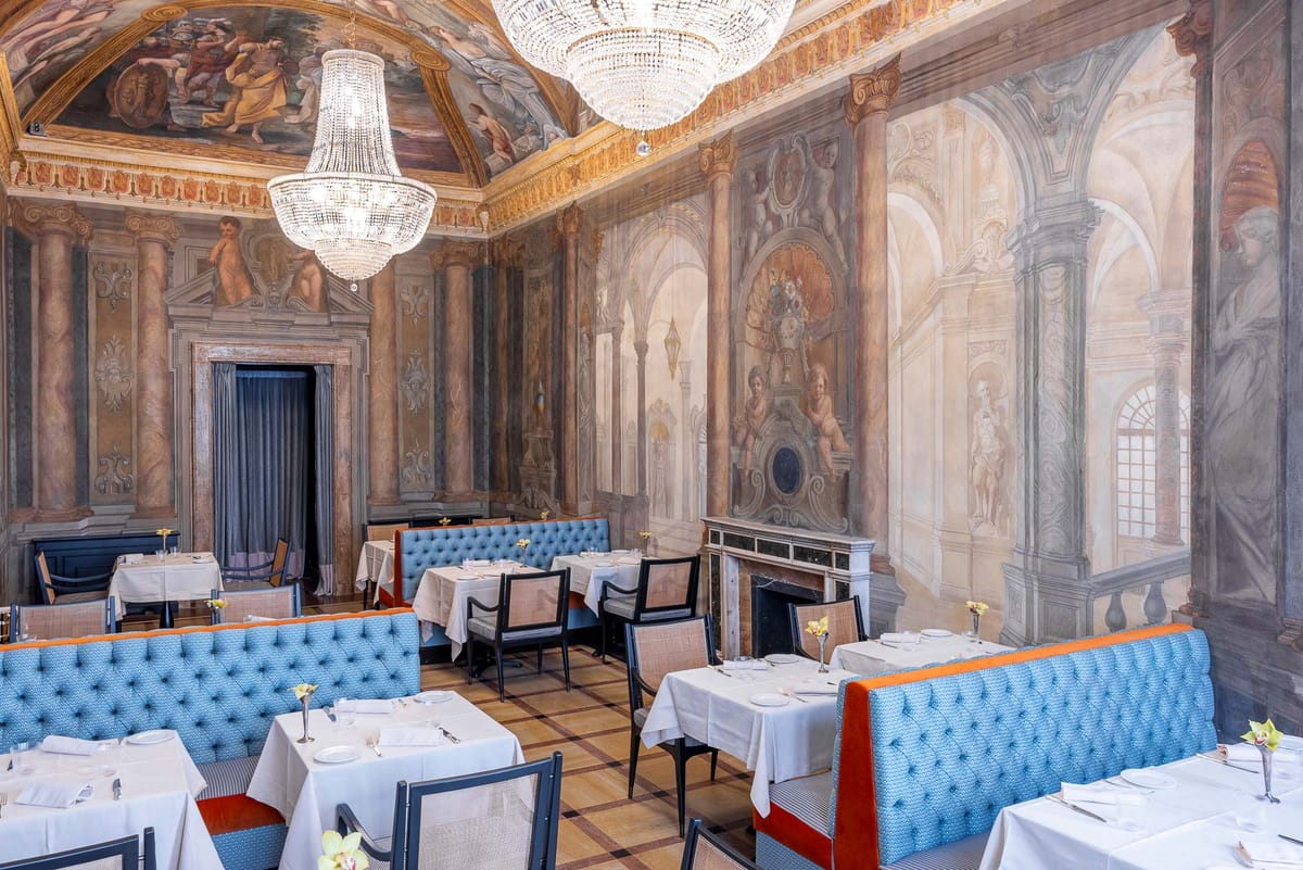 The 39 rooms and suites and public areas are embellished with original frescoes, coffered ceilings, inlaid wood panels, Versailles-style parquet floors, and precious marbles.