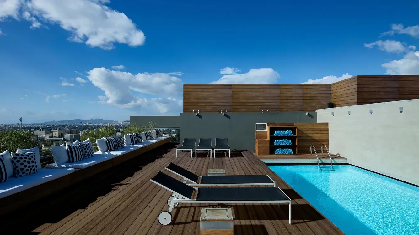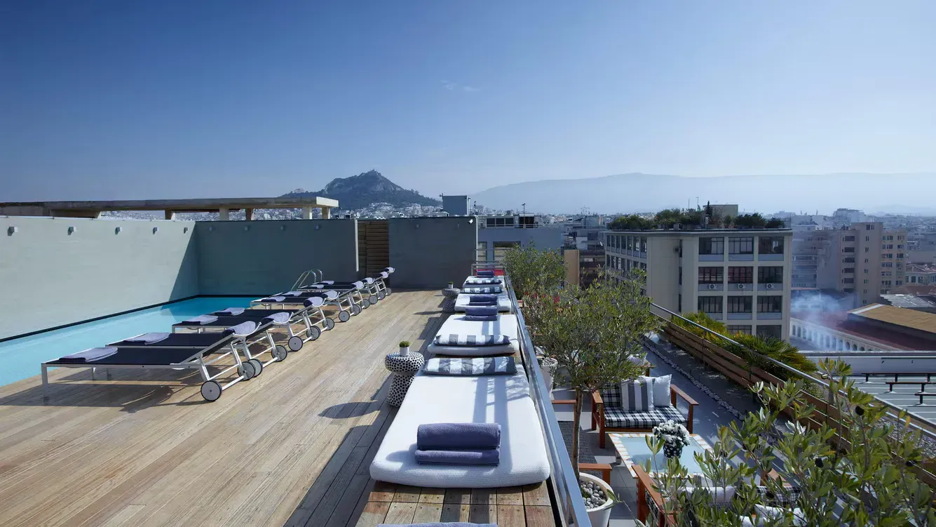 The 133 rooms are cutting-edge and innovative, with modernist furnishings such as Eames chairs, and come equipped with amenities such as flat-screen TVs and wireless internet access. There are also some additional amenities depending on the location: views of the Acropolis, which is visible to all from the vantage point of the rooftop pool terrace.