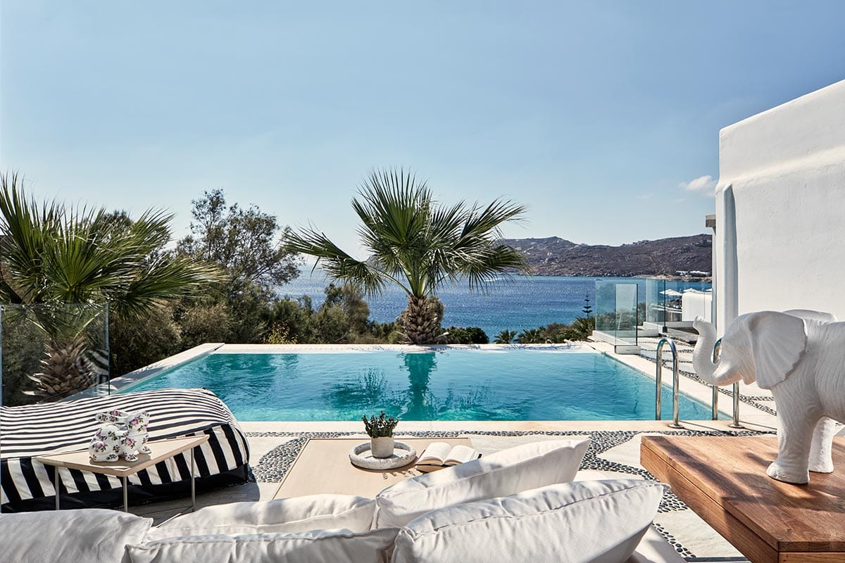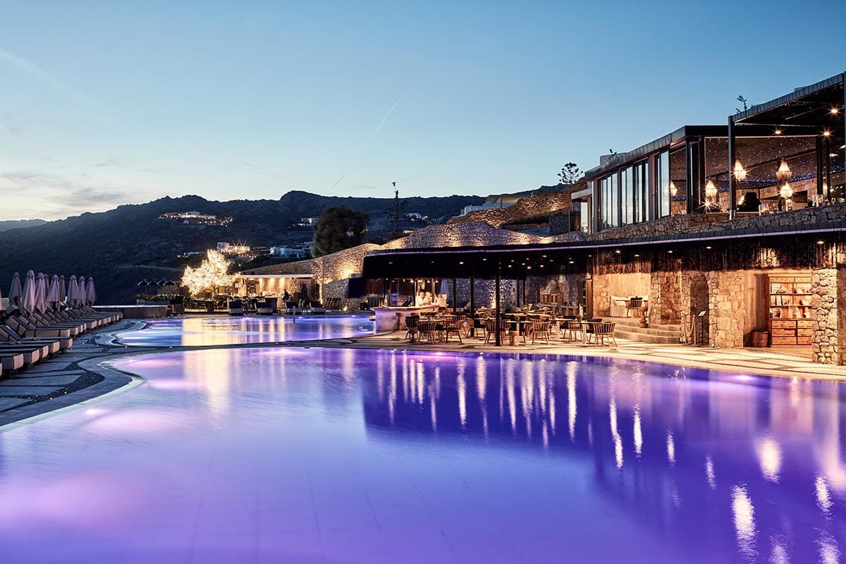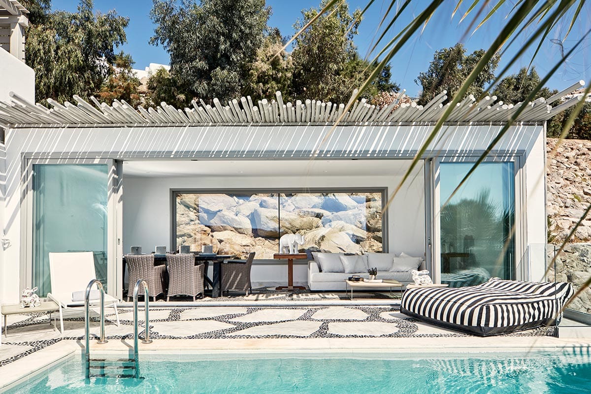 Myconian Imperial prides itself on the luxury of its spacious rooms and suites, which combine modern comfort with traditional Cycladic charm. The hotel’s designer visualized the atmosphere as “a metropolitan loft over the sea, a canvas of all-white materials, furniture and accessories that enhance textures, light and structure.” The surrounding terrain features stone and wood, and the tonal contrast of the design elements is a tribute to the international flavor that permeates everything in Mykonos.