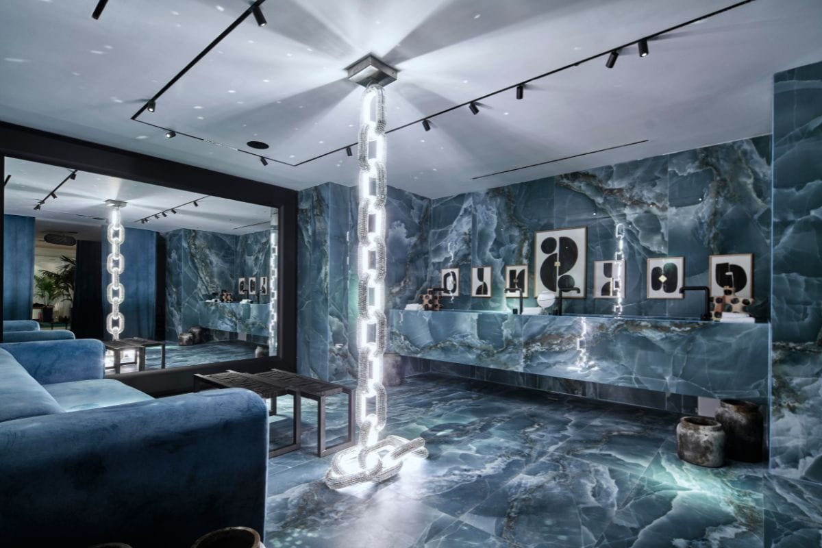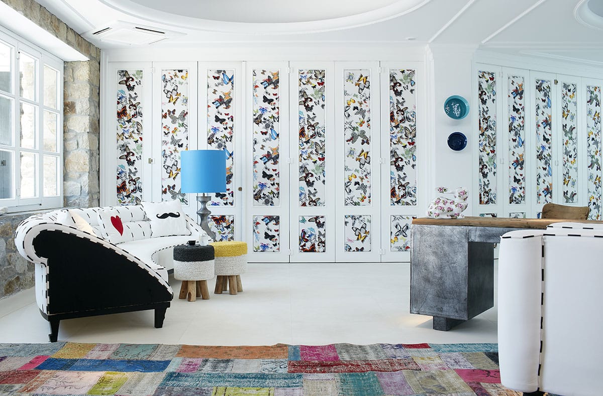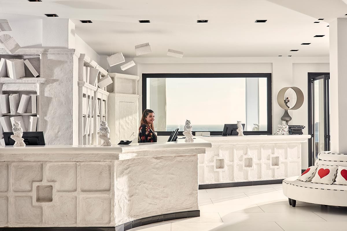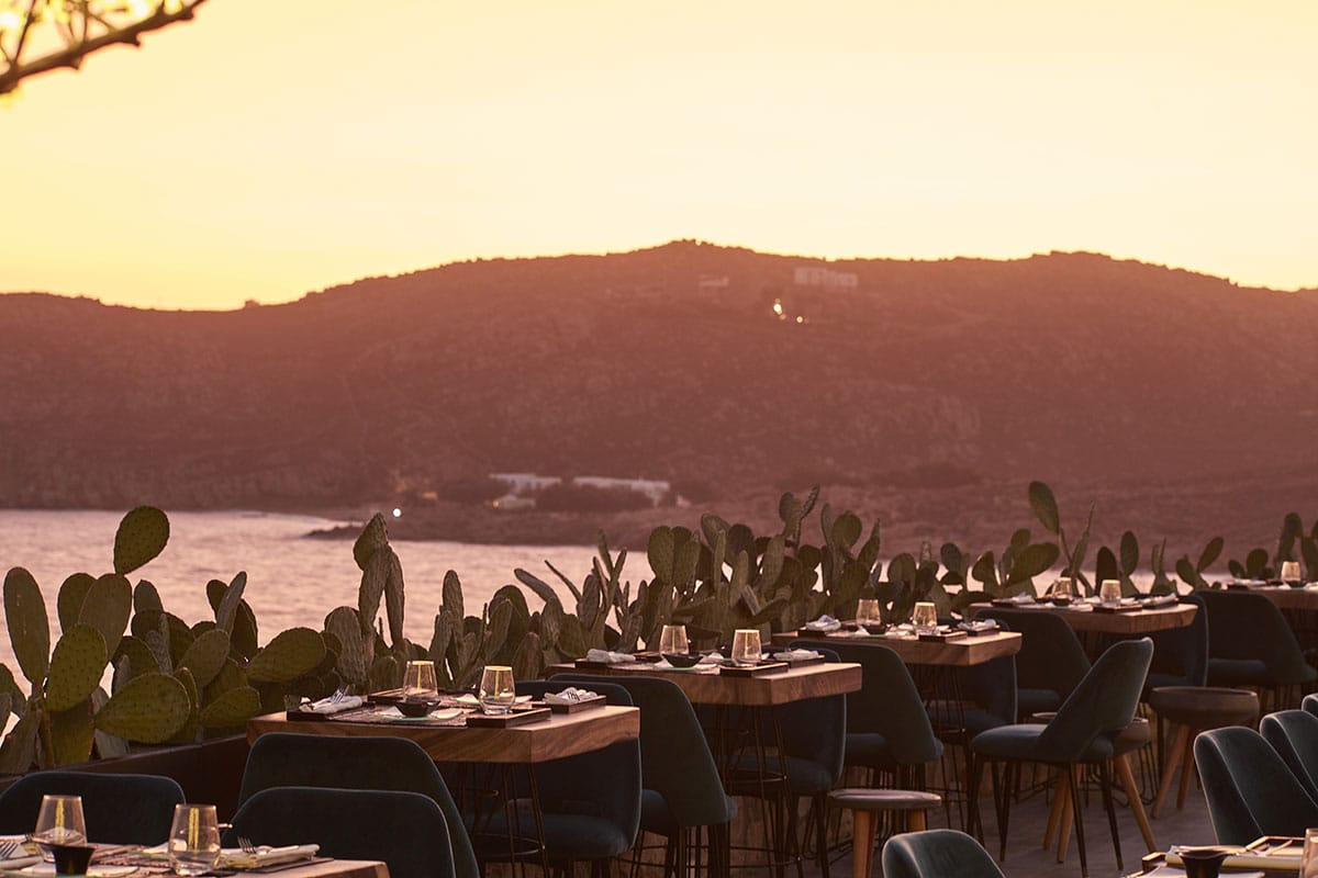 Myconian Imperial prides itself on the luxury of its spacious rooms and suites, which combine modern comfort with traditional Cycladic charm. The hotel’s designer visualized the atmosphere as “a metropolitan loft over the sea, a canvas of all-white materials, furniture and accessories that enhance textures, light and structure.” The surrounding terrain features stone and wood, and the tonal contrast of the design elements is a tribute to the international flavor that permeates everything in Mykonos.