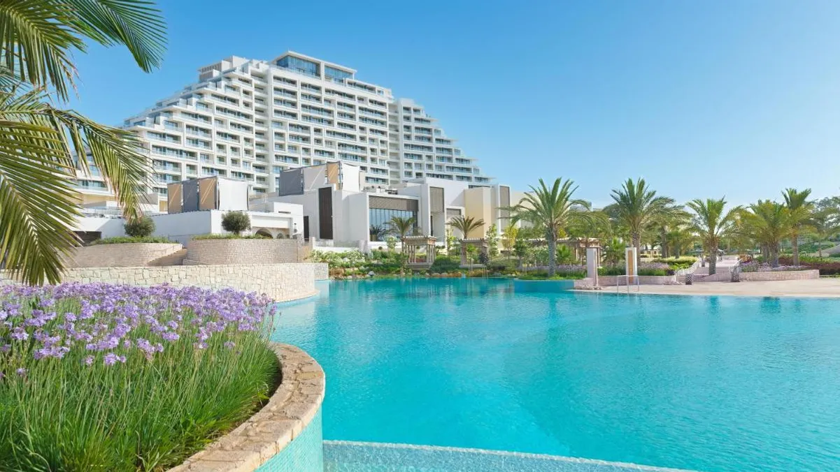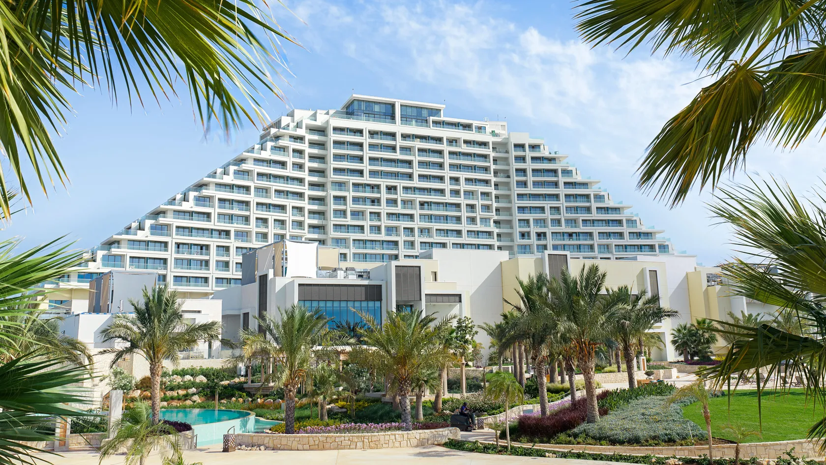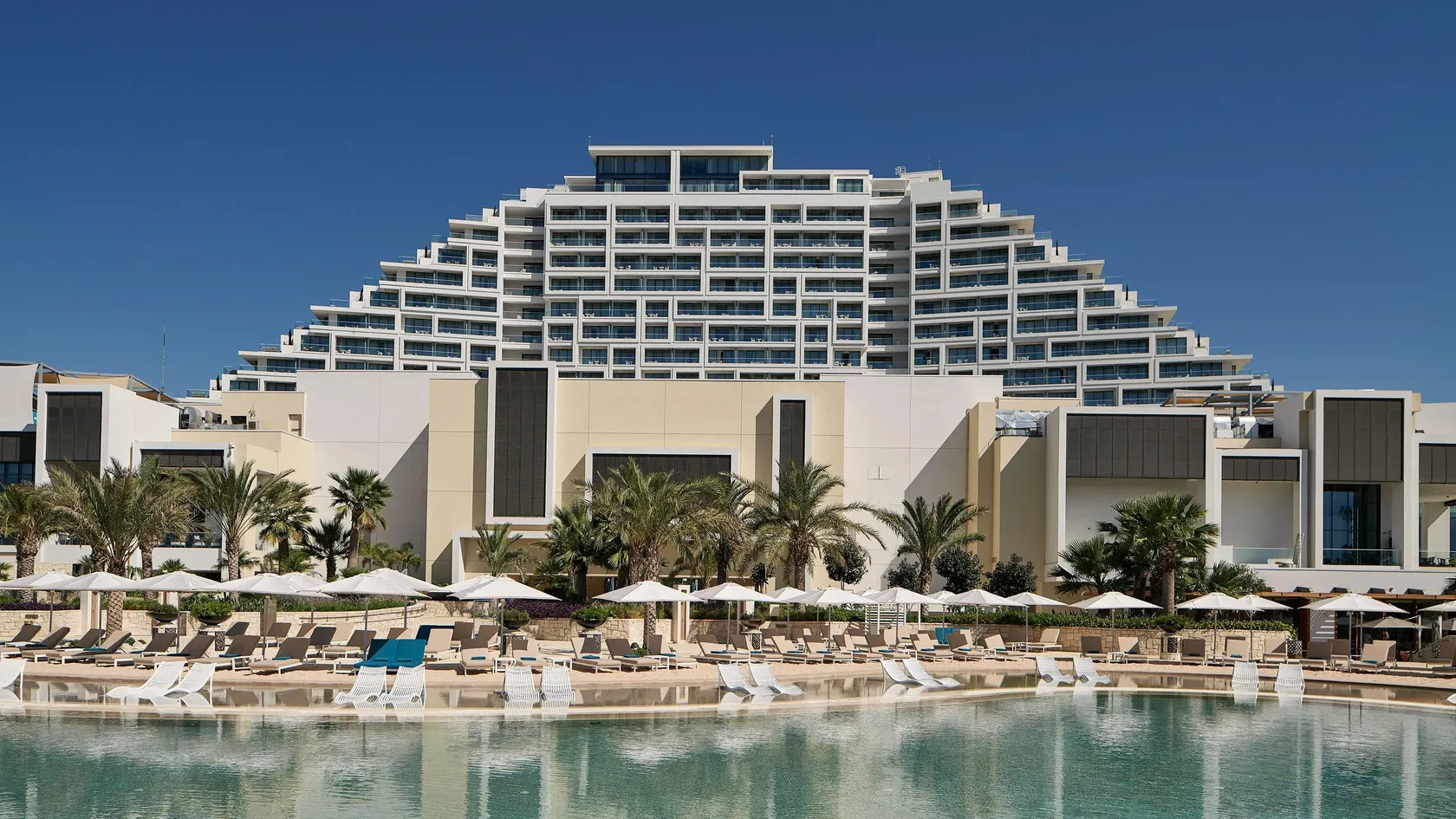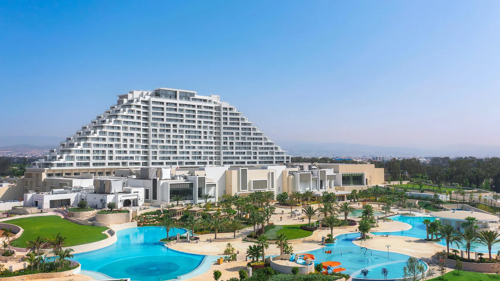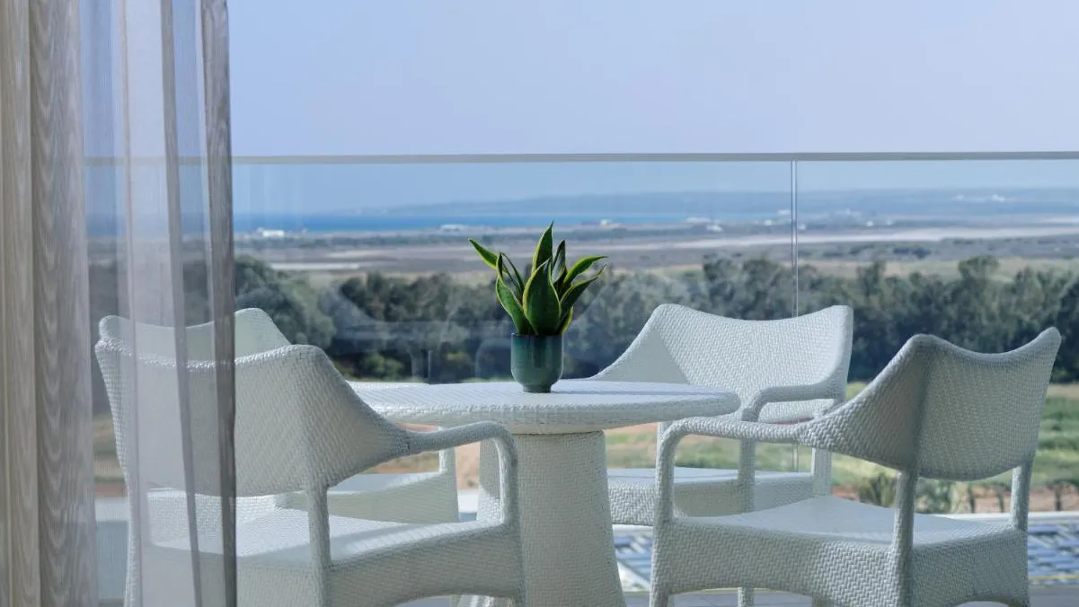 The tallest resort in Cyprus with 14 storeys with a total of 476 rooms and 24 suites, ranging from 49 to 580 sqm. offering scenic views of the Akrotiri Salt Lake or the manicured gardens and sparkling pools.
