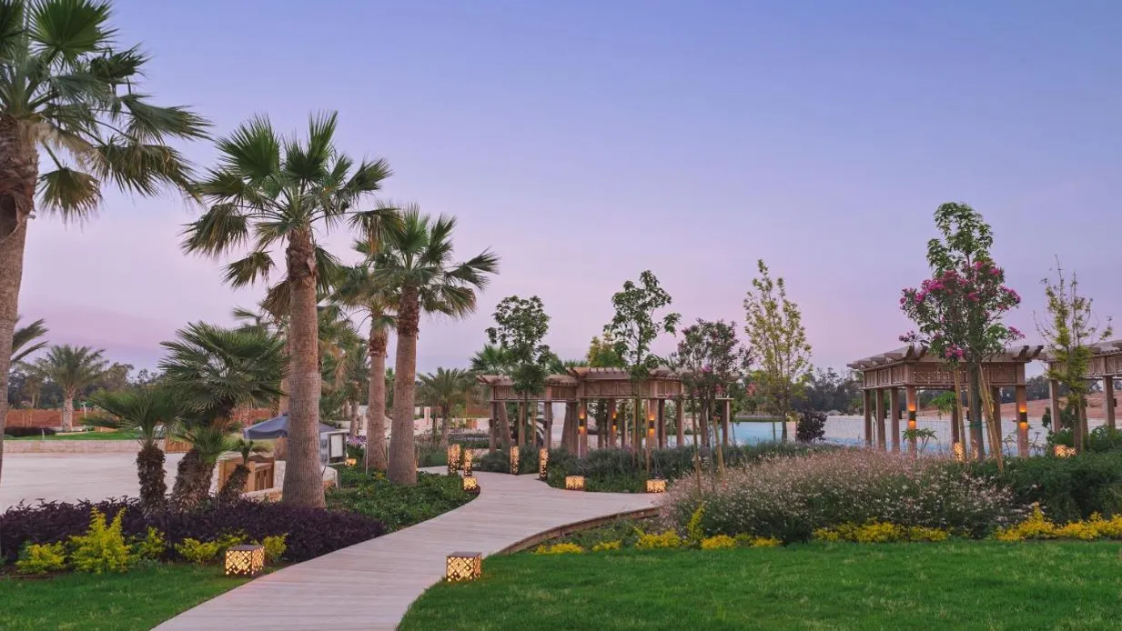Viewmanicured gardens and fountains of the resort’s entrance